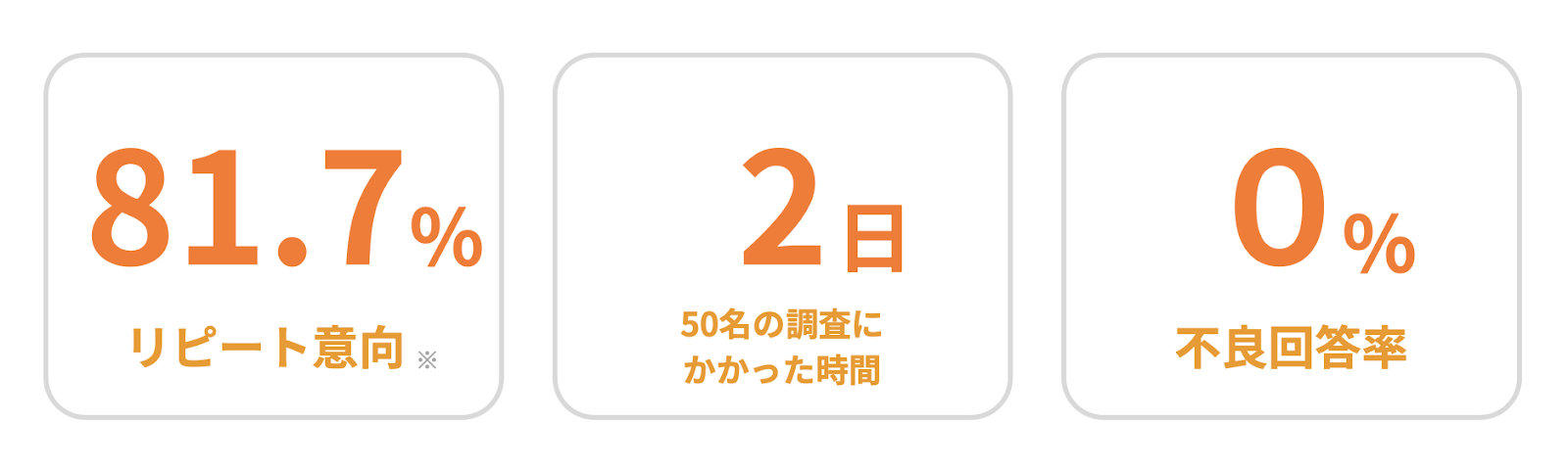 ユニーリサーチのパネル(数万人規模)を活用することで、最短当日でのリサーチが可能です。独自の実証実験では、以下の驚異的な数値を記録しています。